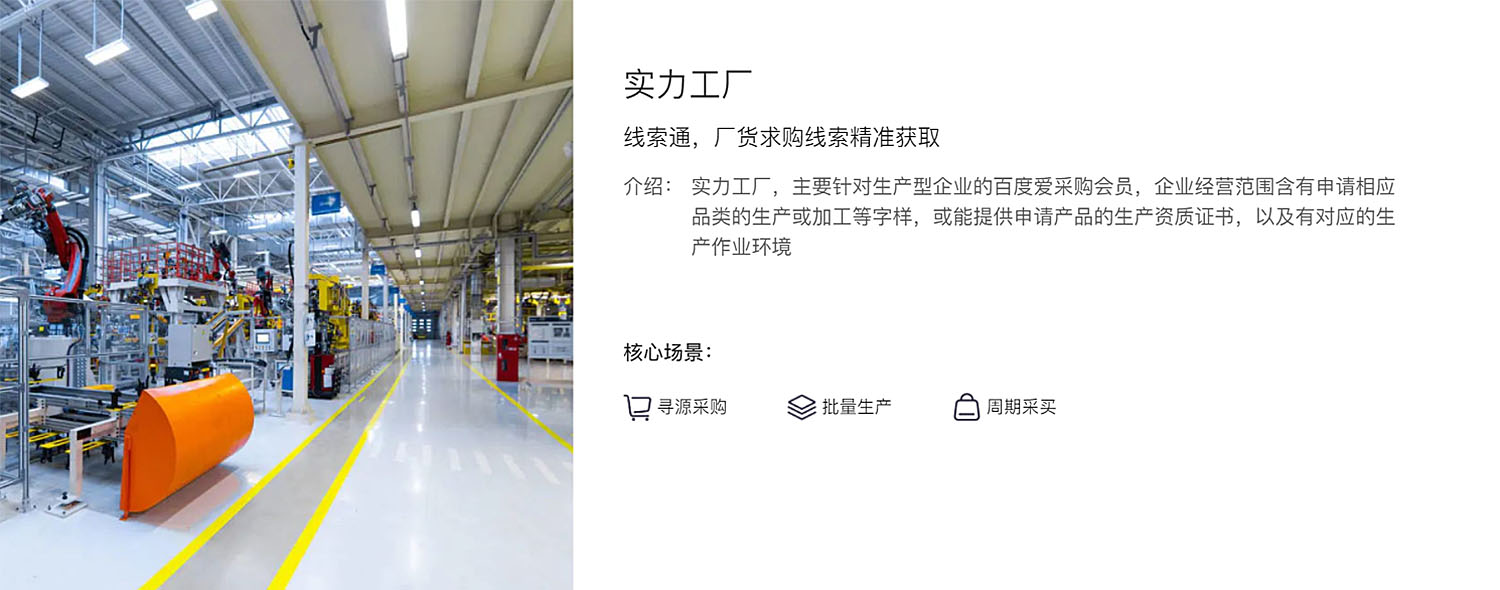 主要針對(duì)生產(chǎn)型企業(yè)的百度愛(ài)采購(gòu)會(huì)員,企業(yè)經(jīng)營(yíng)范圍含有申請(qǐng)相應(yīng)品類(lèi)的生產(chǎn)或加工等字樣,或能提供申請(qǐng)產(chǎn)品的生產(chǎn)資質(zhì)證書(shū),以及有對(duì)應(yīng)的生產(chǎn)作業(yè)環(huán)境